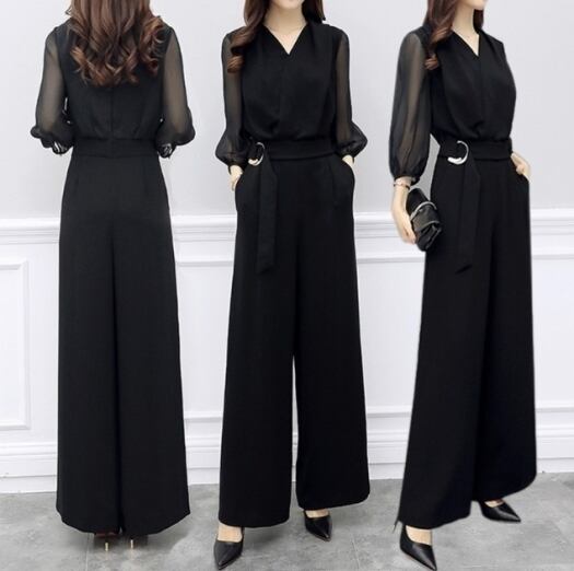 七分袖 黒 オールインワン Vネック パンツスーツ [gg-0014]