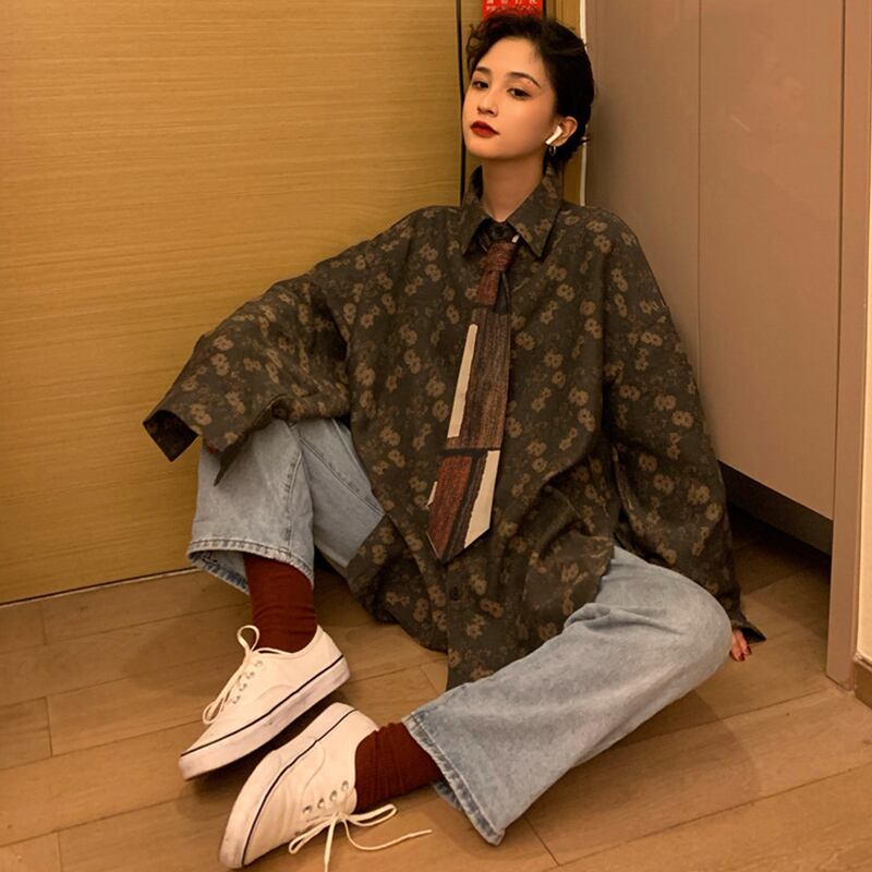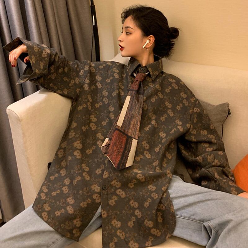 長袖 ルーズヒット ネクタイ ゆったり 総柄 シャツ [gg-0122]