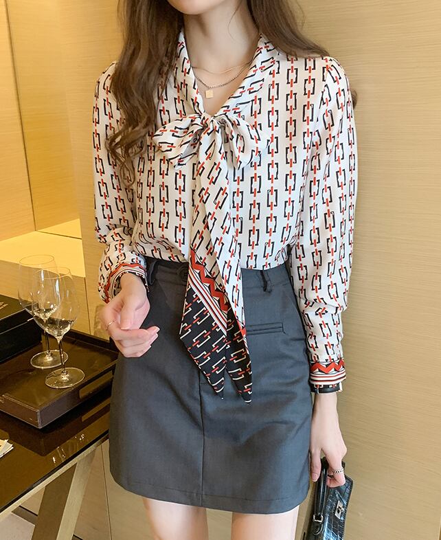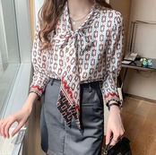 総柄 ボウタイ ブラウス 秋 春 トップス 韓国 [gg-0191]