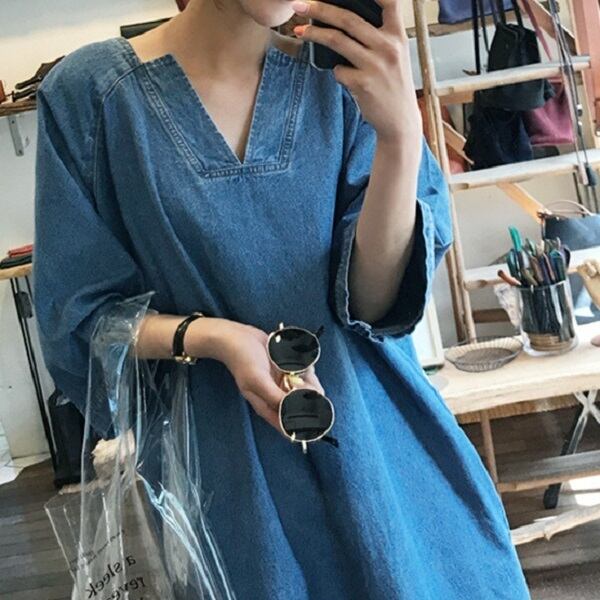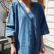 Vネック デニム ロングワンピース 七分袖 マキシ丈 [gg-0277]