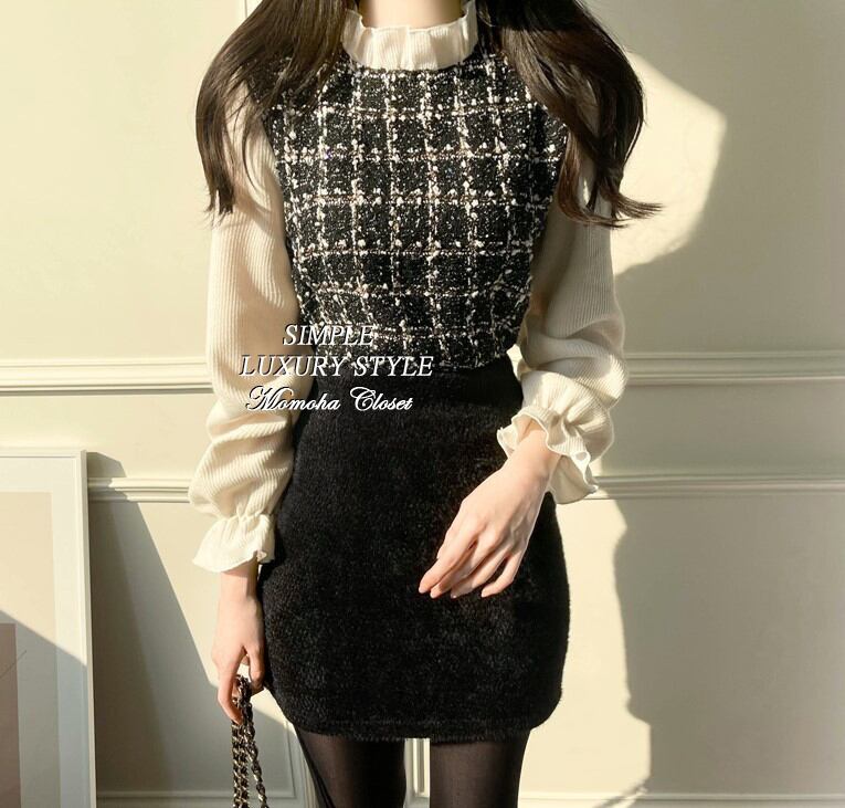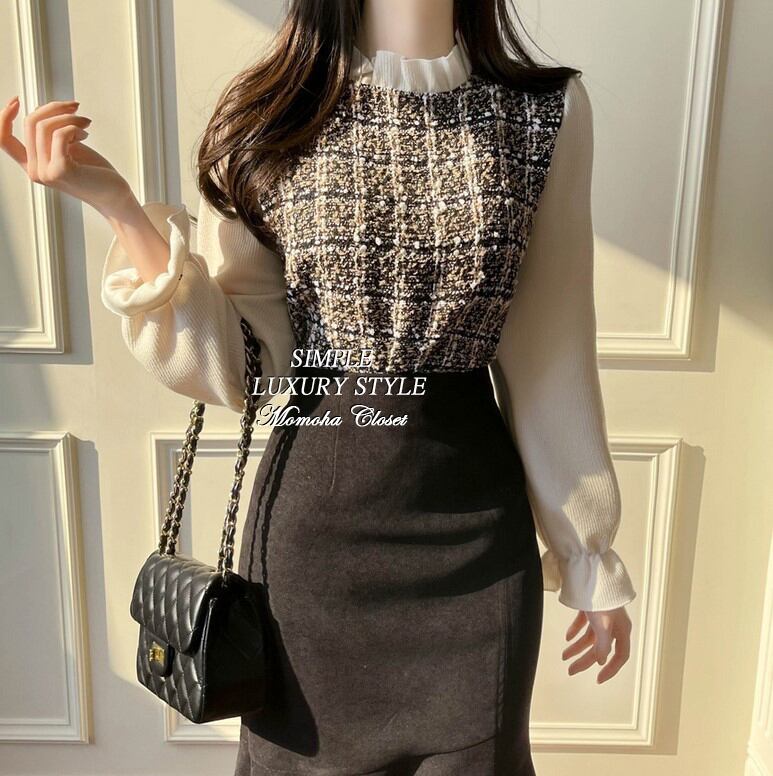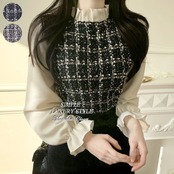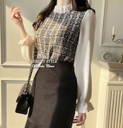 袖フリル ツイード チェックMIX ブラウス [gg-0294]