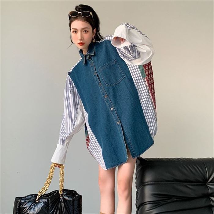 トップス デニム 切り替え ブラウス オーバーサイズ 柄シャツ [gg-0318]