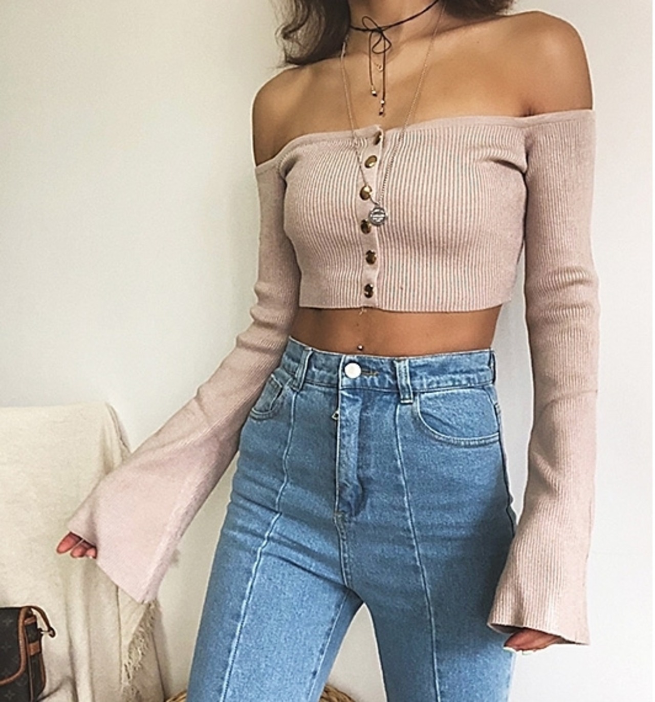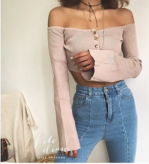 クロップ丈リブニットオフショルトップス [gg-0387]