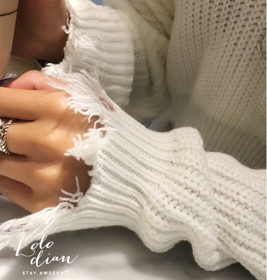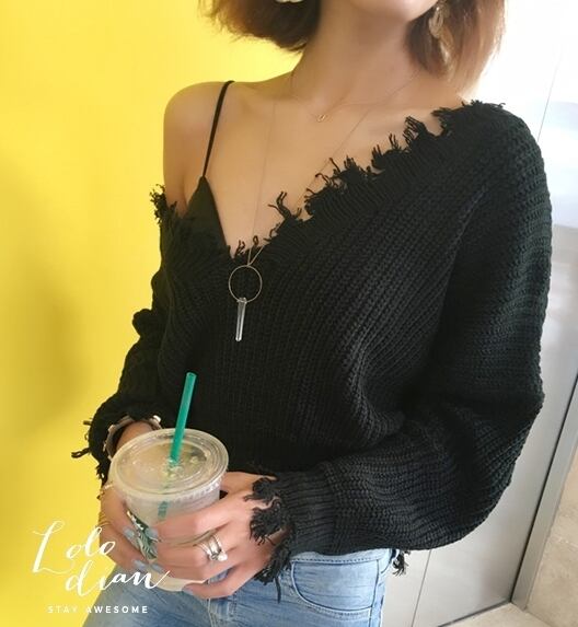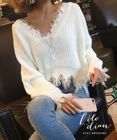 Vネックフリンジ ショートニットトップス(3色) [gg-0394]