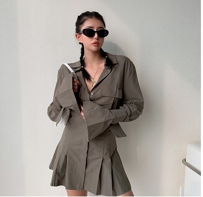 Aライン ウエスト プリーツ シャツ ワンピース ドレス [gg-0425]