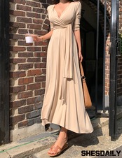 ウエスト リボン ラップデザイン フレア ワンピース [gg-0438]