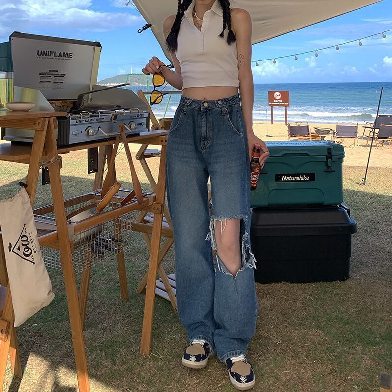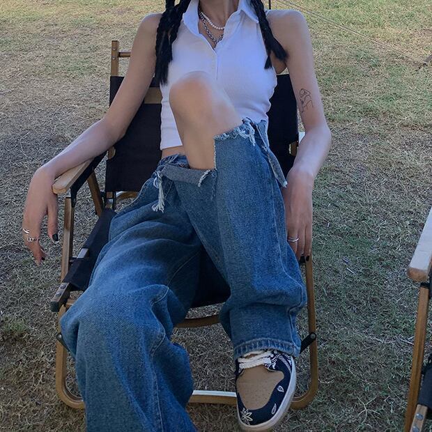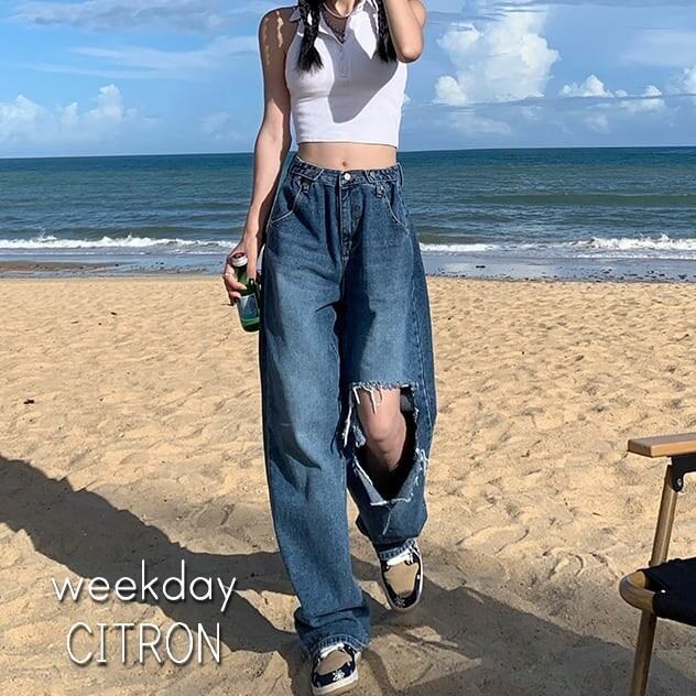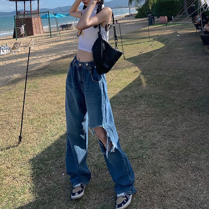 クラッシュ ワイド デニム パンツ ダメージジーンズ 韓国 [gg-0509]