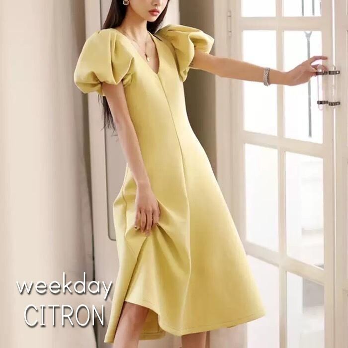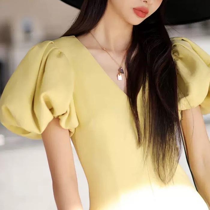 Vネック パフスリーブ ワンピース フェミニン 韓国 [gg-0547]