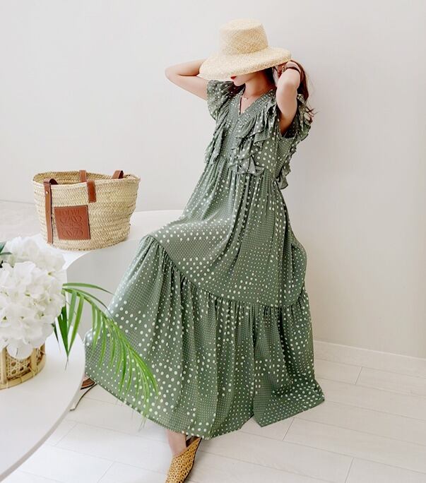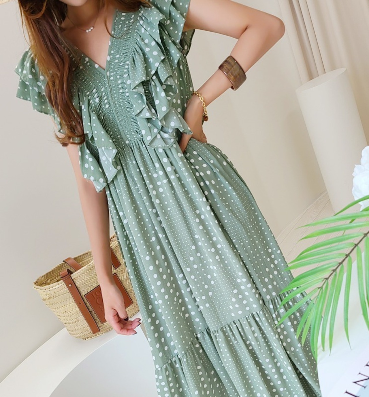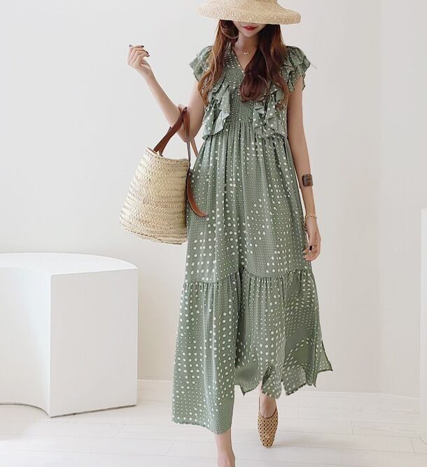 フェミニン ドットフリル マキシワンピース 2カラー [gg-0562]