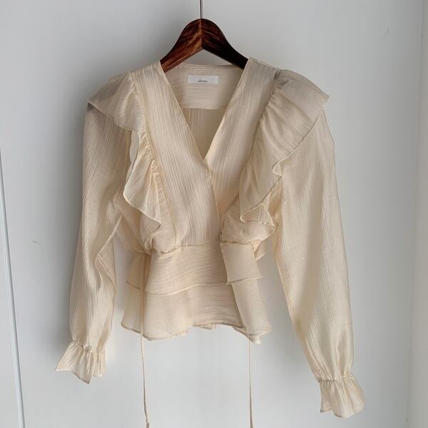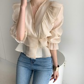 大人可愛い 韓国 フリル ペプラム シフォンブラウス ショート丈 [gg-0597]