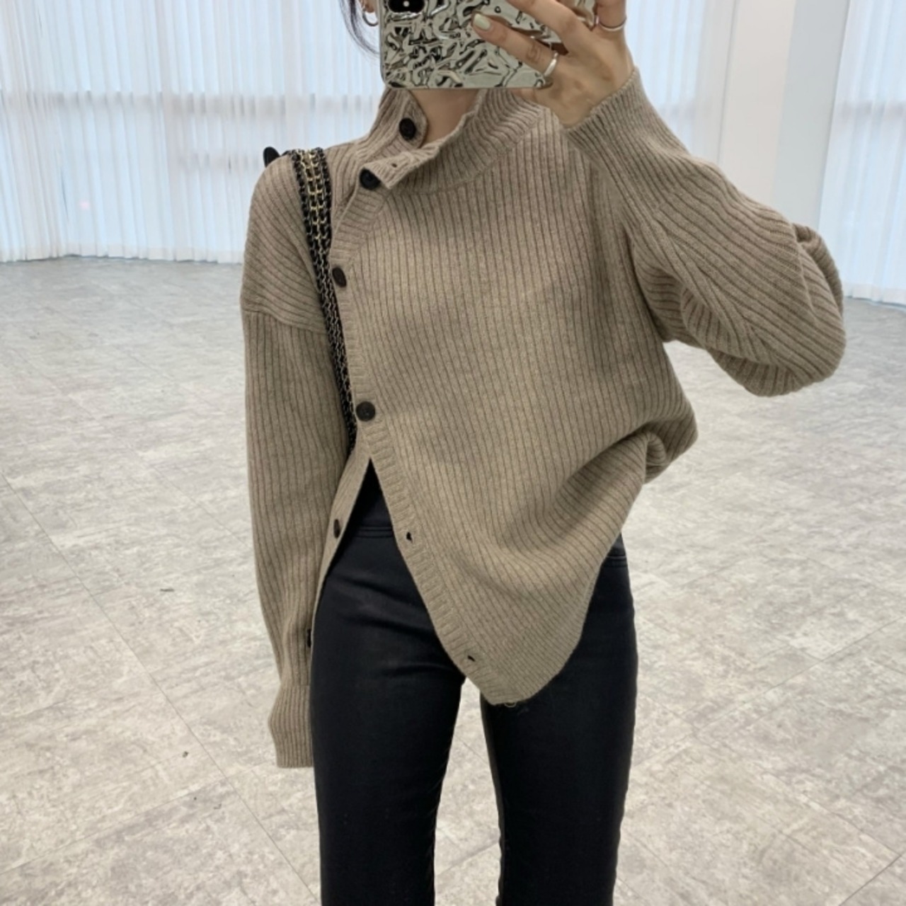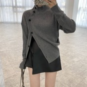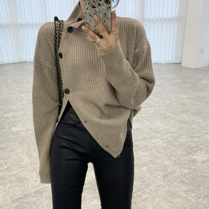 ハイネック リブニット アシンメトリー ボタン 韓国 2color [gg-0609]