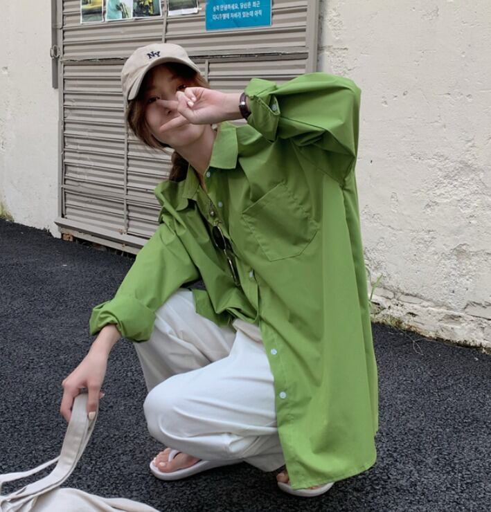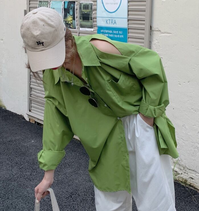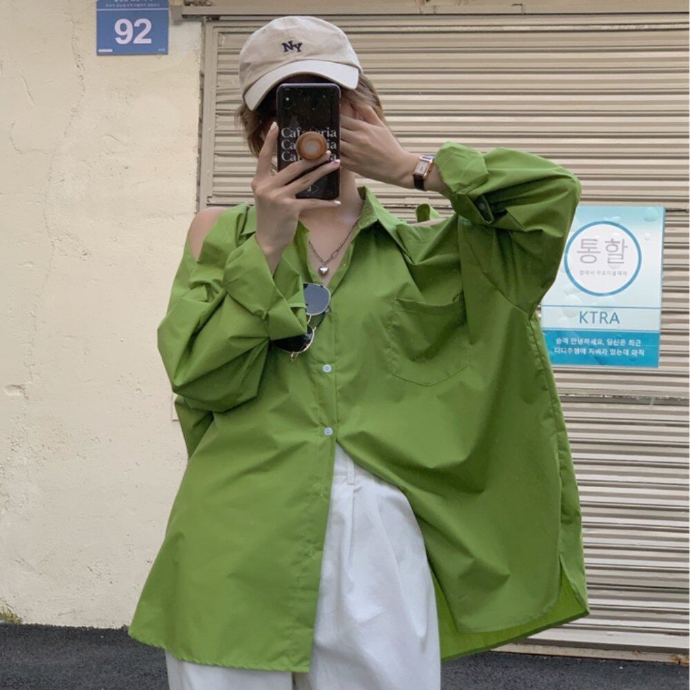 オフショル グリーン シャツ 長袖 韓国 カジュアル [gg-0708]