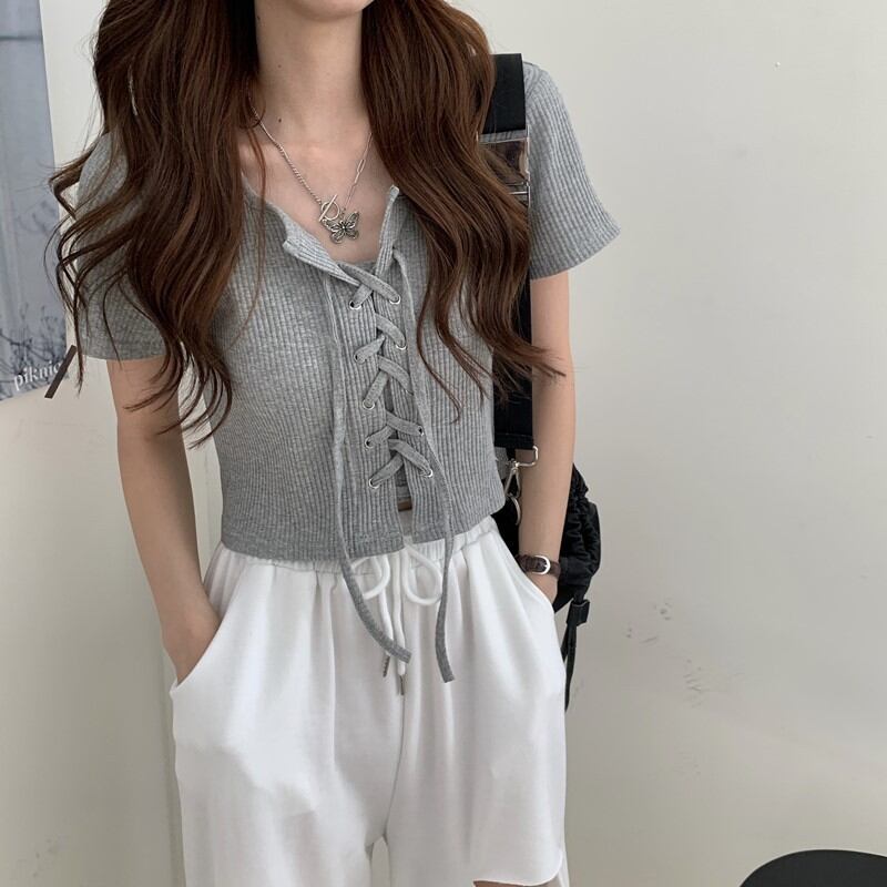 レースアップ トップス ショート丈 無地 韓国 春夏 [gg-0736]