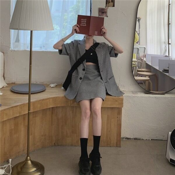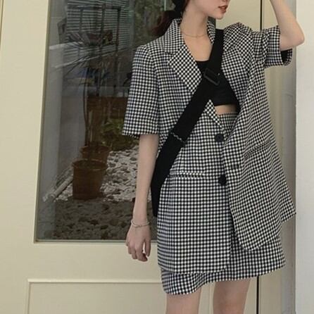 レディース セットアップ チェック柄 半袖ジャケット スカート [gg-0757]