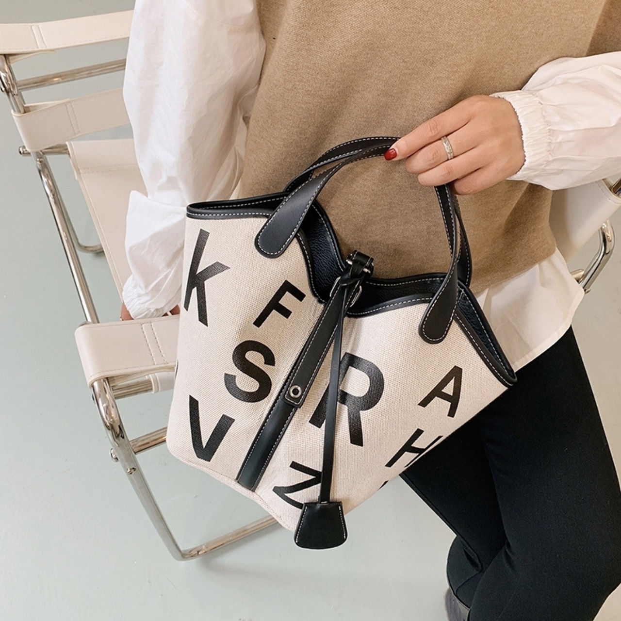 英字 キャンバス トートバッグ ポーチ付き 万能 おしゃれ 韓国 [gg-0615]