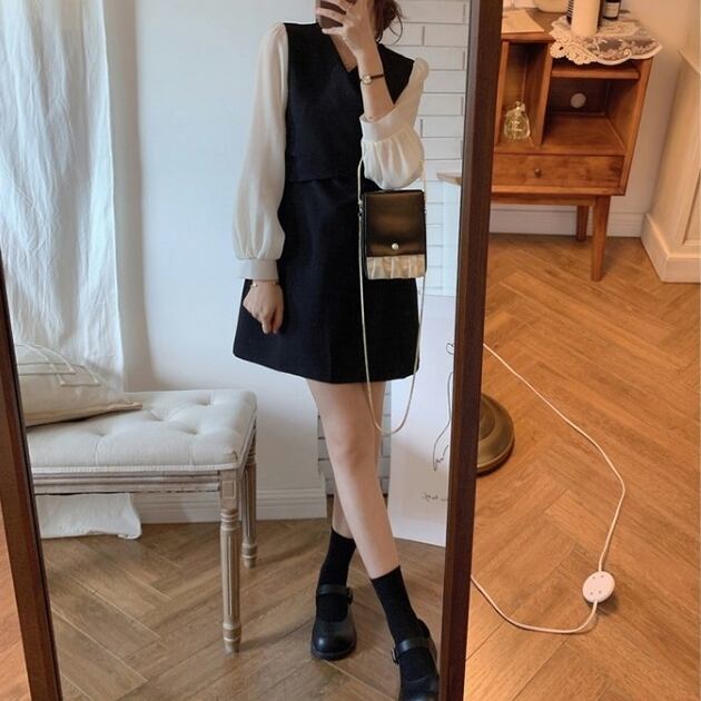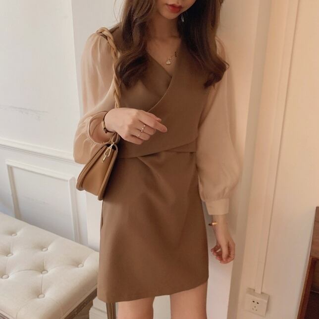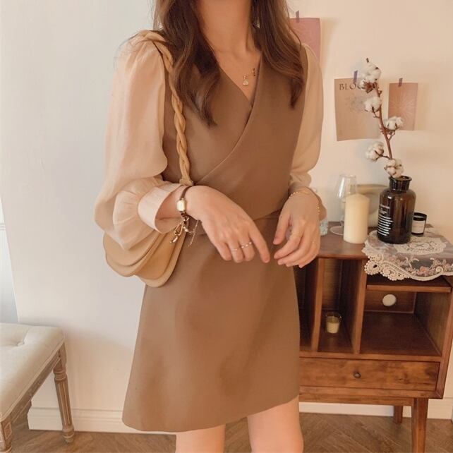 レイヤード風 ドッキングワンピース ミニ丈 異素材mix 韓国 [gg-0619]