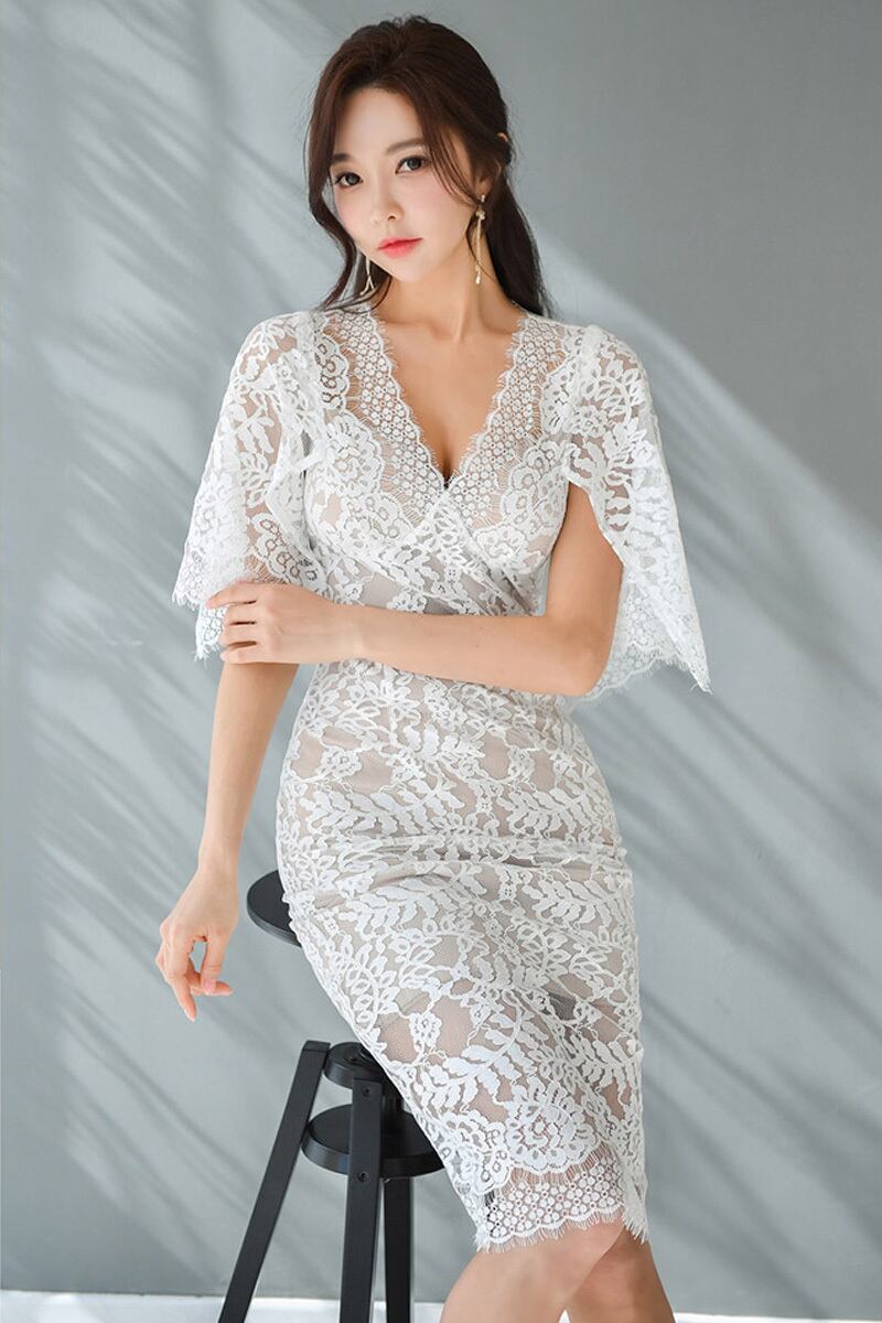 全2色 シアー 総レース ドレス エレガント Vネック [gg-0642]