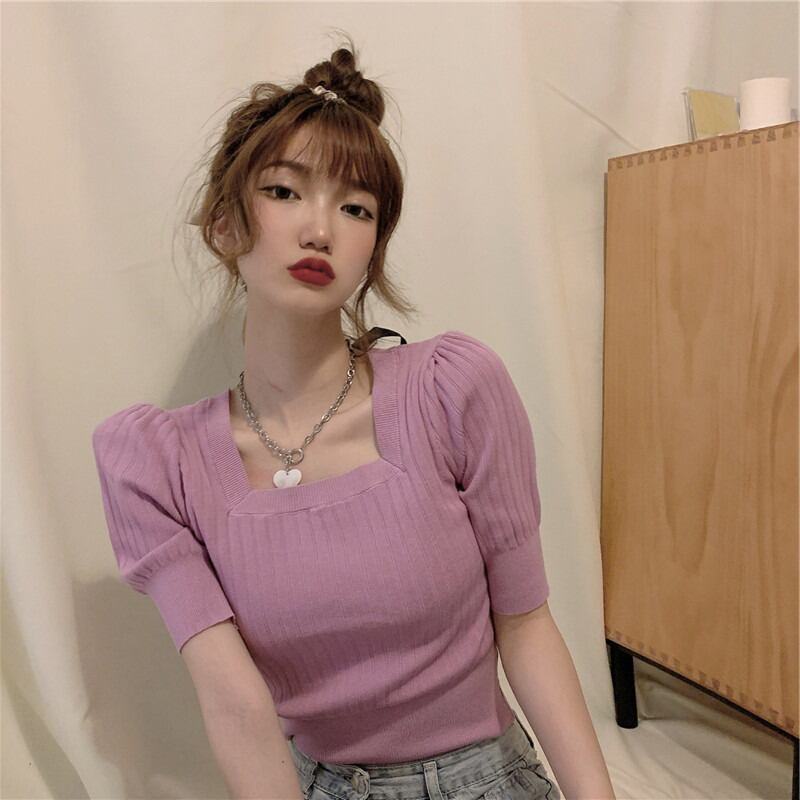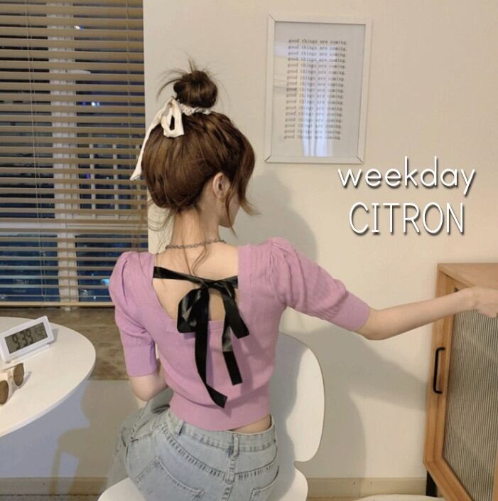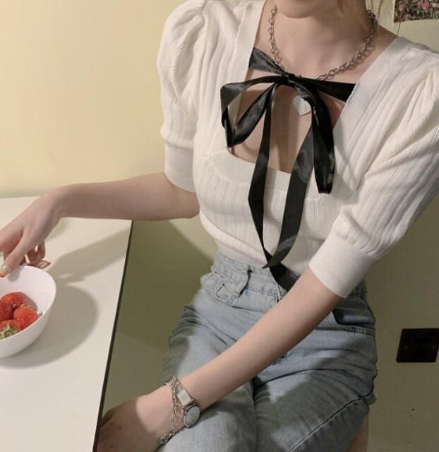 ボウタイ スクエアネック トップス リボン ガーリー 韓国 [gg-0656]