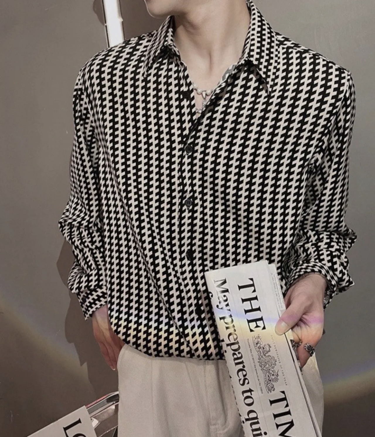 メンズ シャツ 総柄 千鳥格子 長袖 エレガント 韓国 [gg-0657]