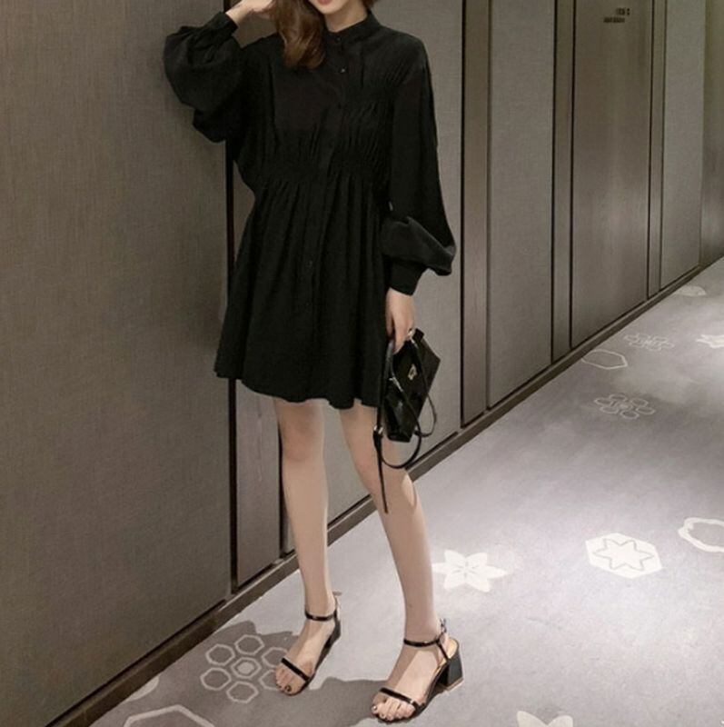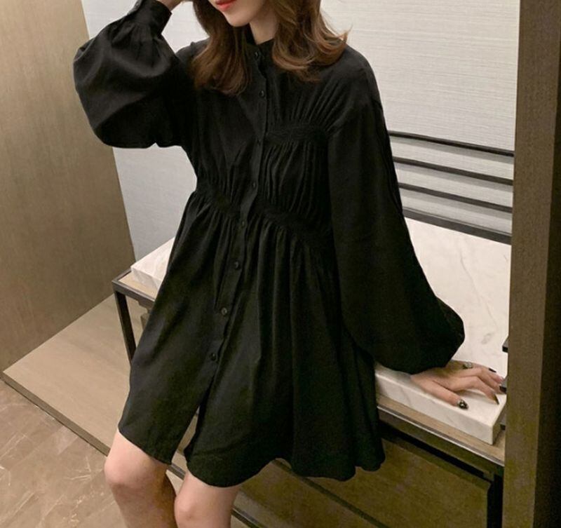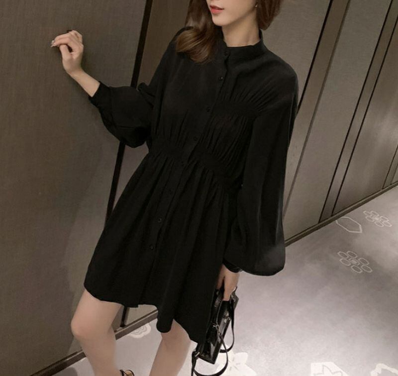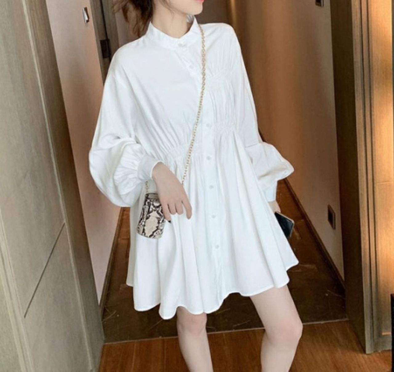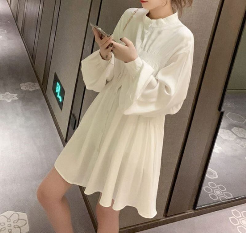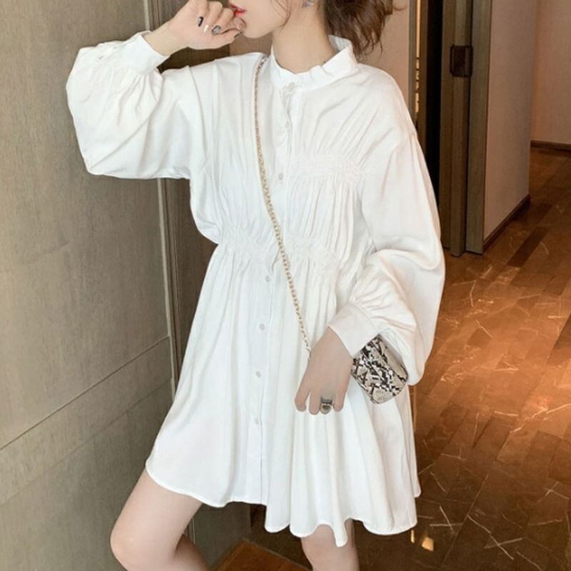 ギャザー パフ スリーブ シャツ ワンピース フレア Aライン 白 [gg-0798]