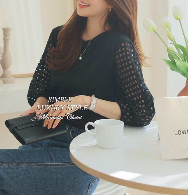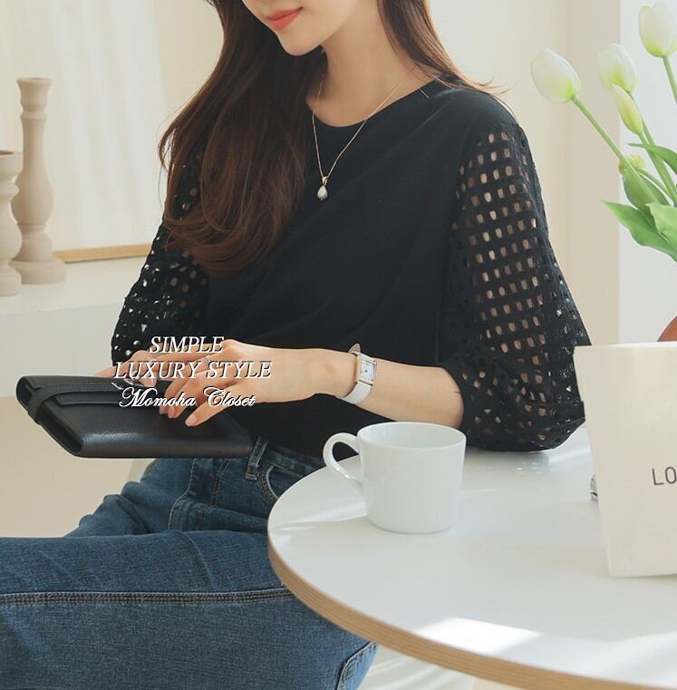 シースルー チェック パンチング ボリューム袖 Tシャツ [gg-0921]