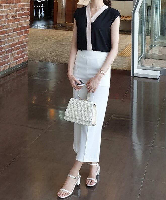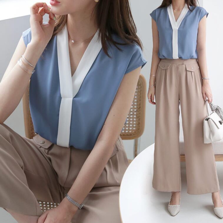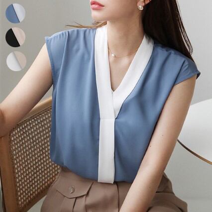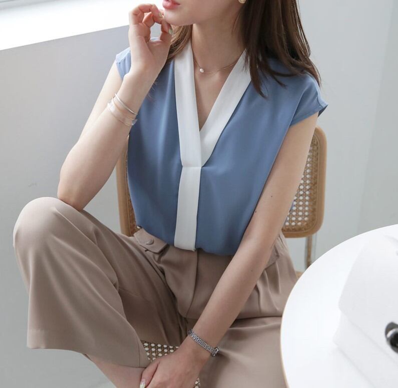 Vライン配色 ツートンカラー シフォン ブラウス [gg-0934]