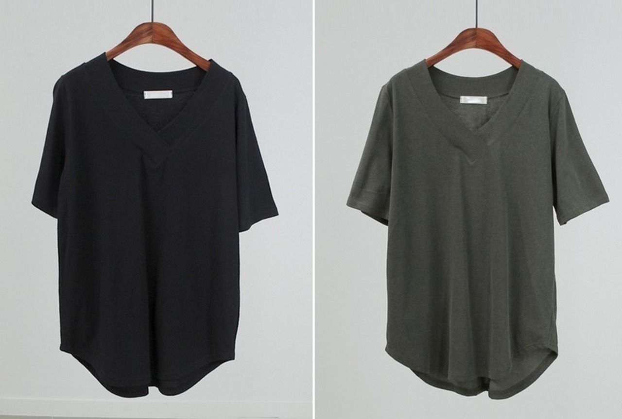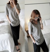 Vネック ラウンド裾 コットン ルーズTシャツ [gg-0954]