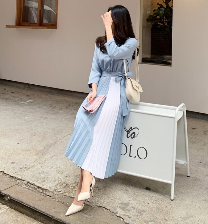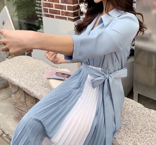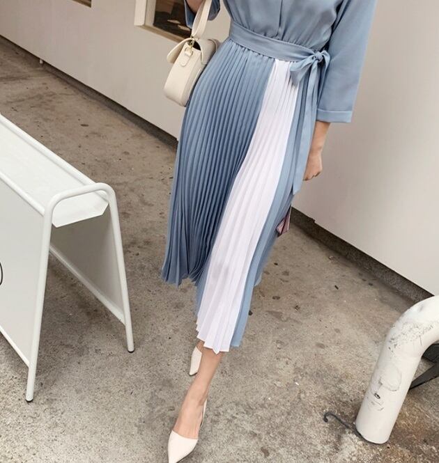大人 きれい 配色プリーツ ロングワンピース [gg-0955]