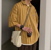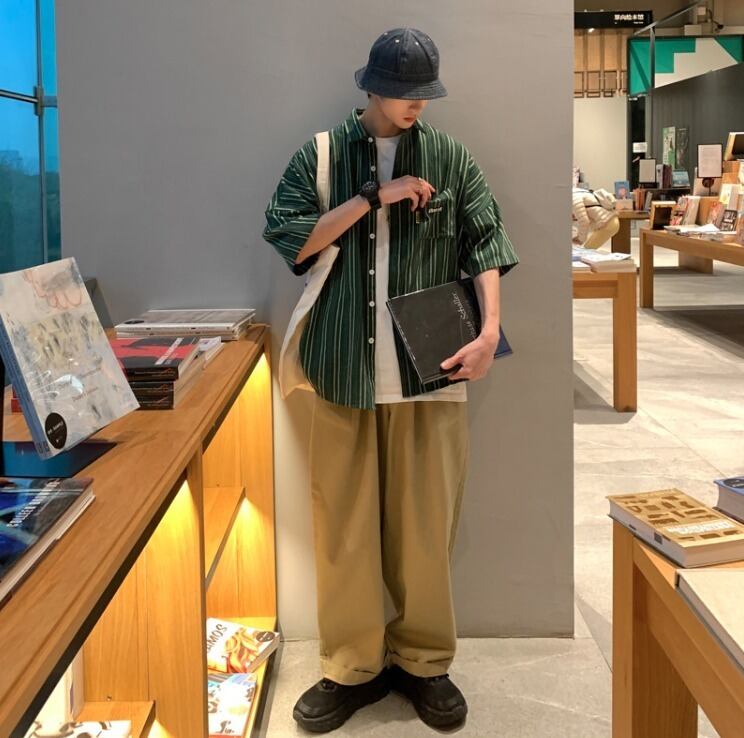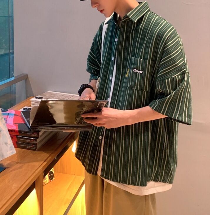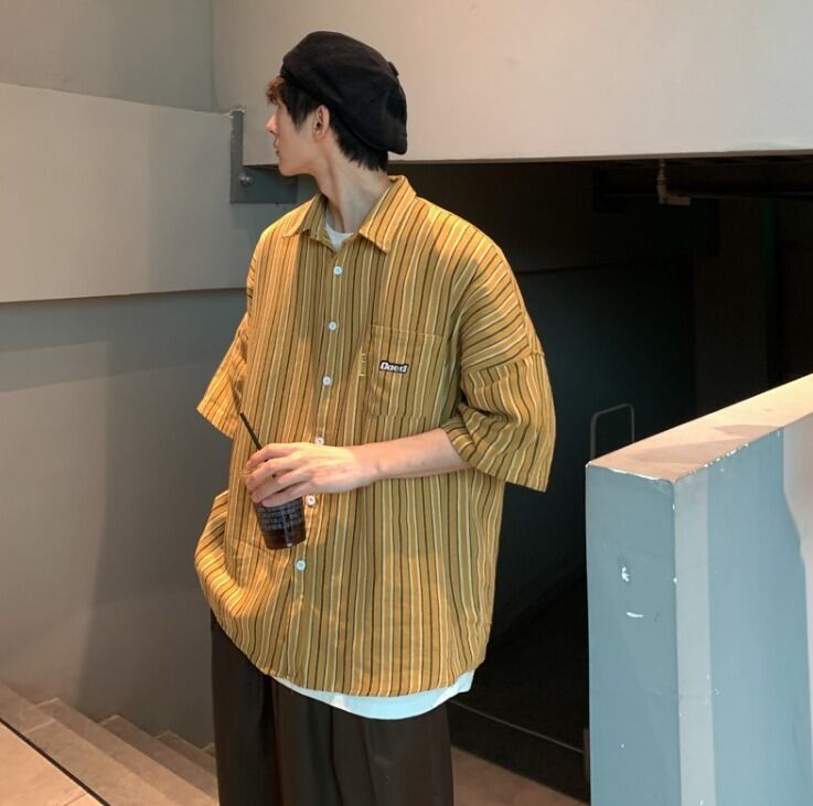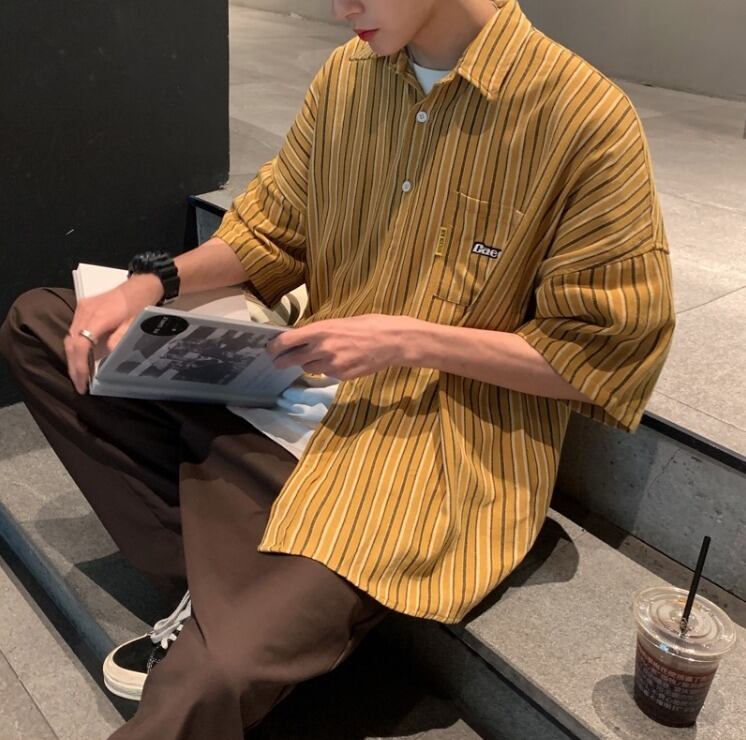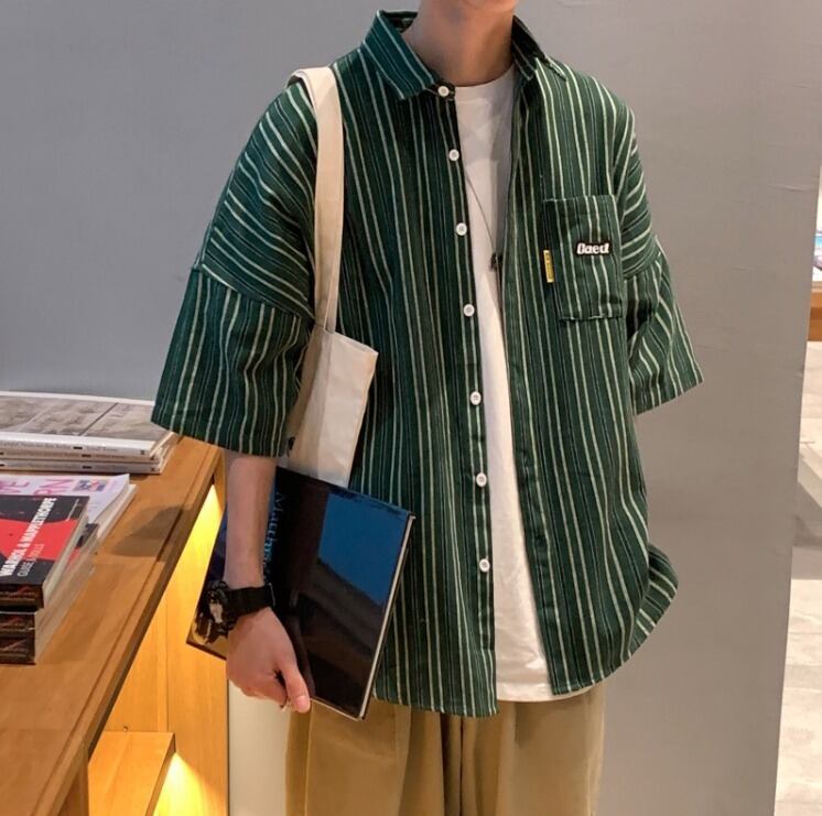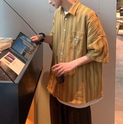 メンズ ストライプ ルーズ シャツ 半袖 韓国 カジュアル [gg-0990]