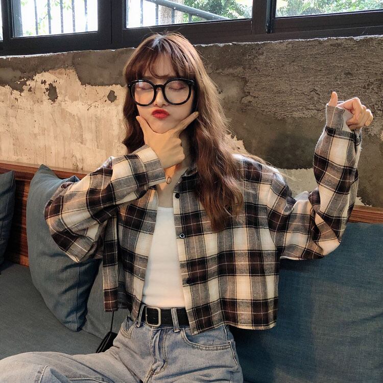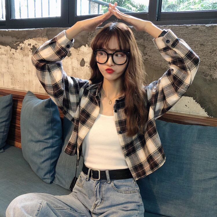 クロップド丈 チェック シャツ ルーズ 2色 秋冬 韓国 [gg-1013]