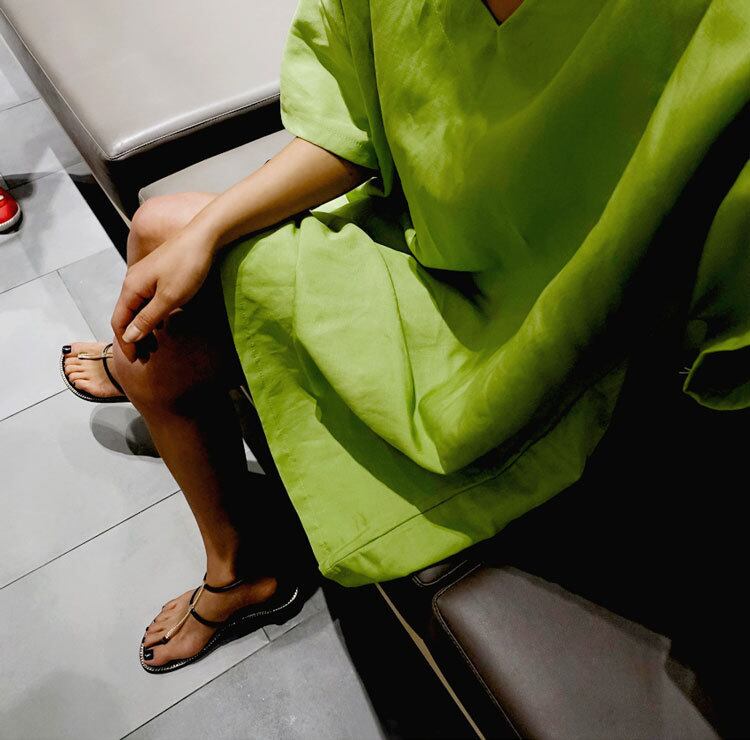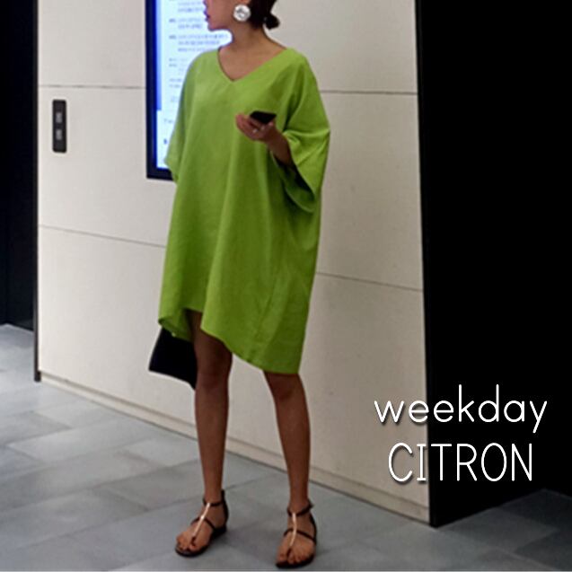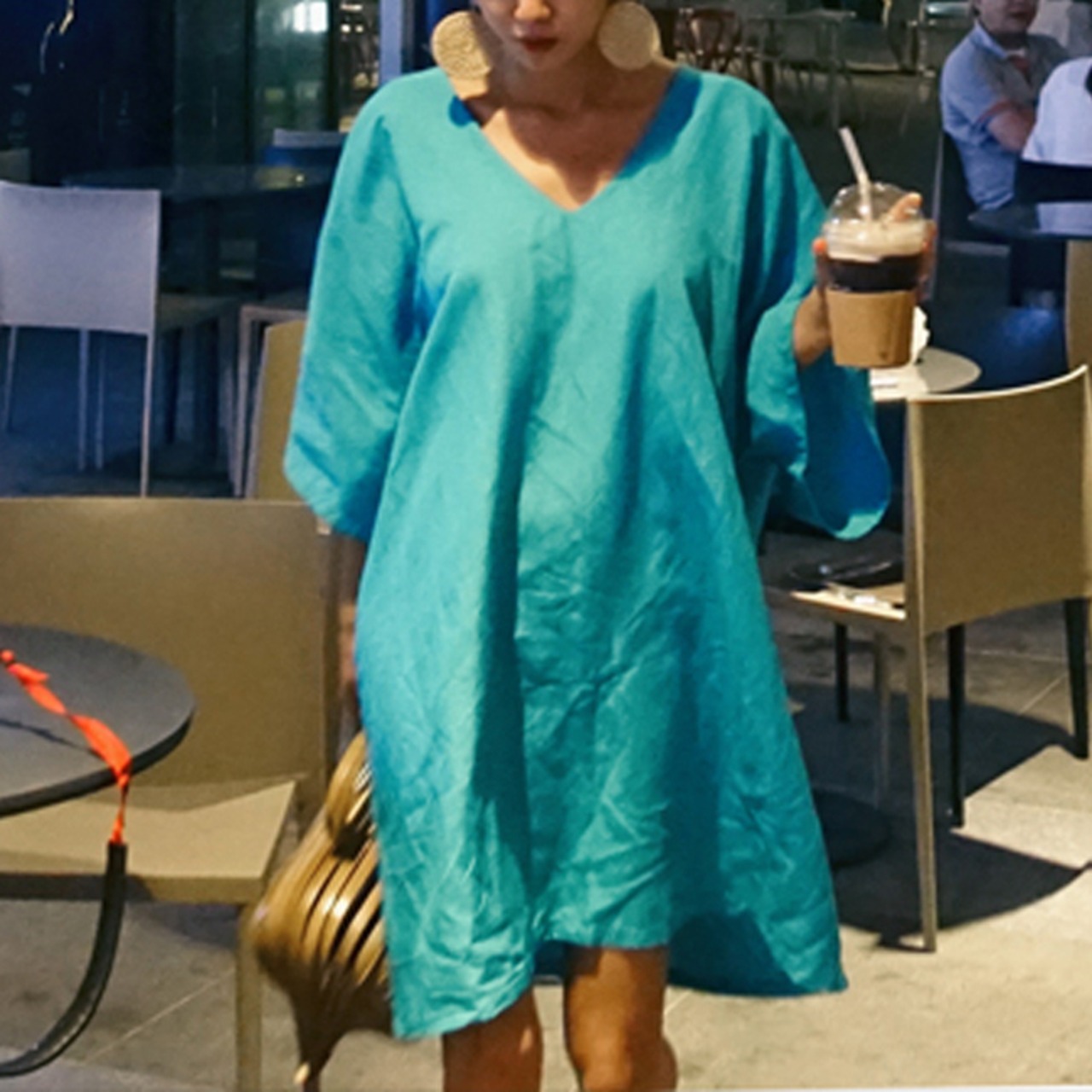 グリーン Vネック ビッグシルエット ワンピース リネン [gg-1015]