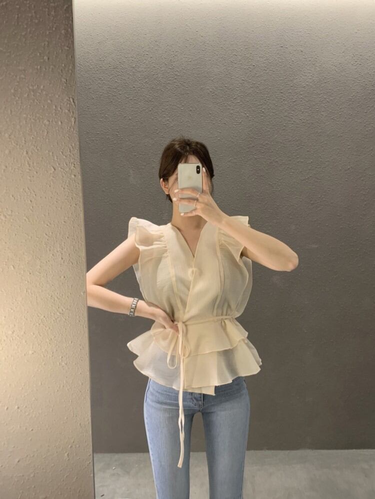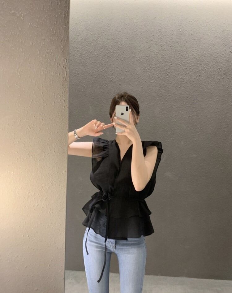 シアー Vネック ぺプラム ウエストマーク 韓国 [gg-1097]