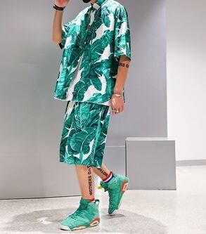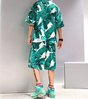 リーフ ハワイアン 柄 アロハシャツ&ハーフパンツ 上下セット [gg-1122]