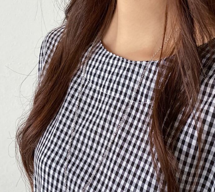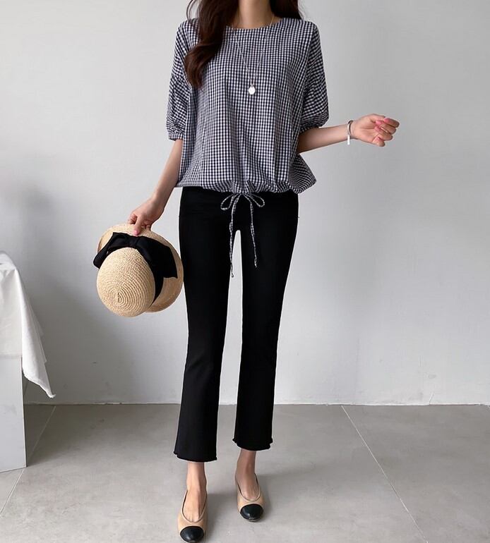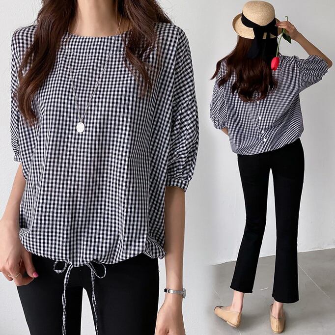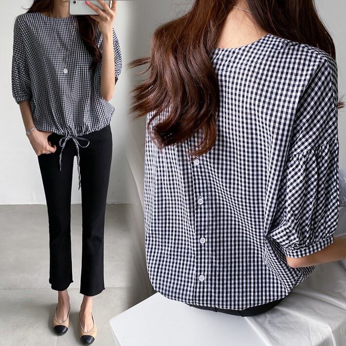 チェック パフスリーブ バックボタン ブラウス [gg-1145]