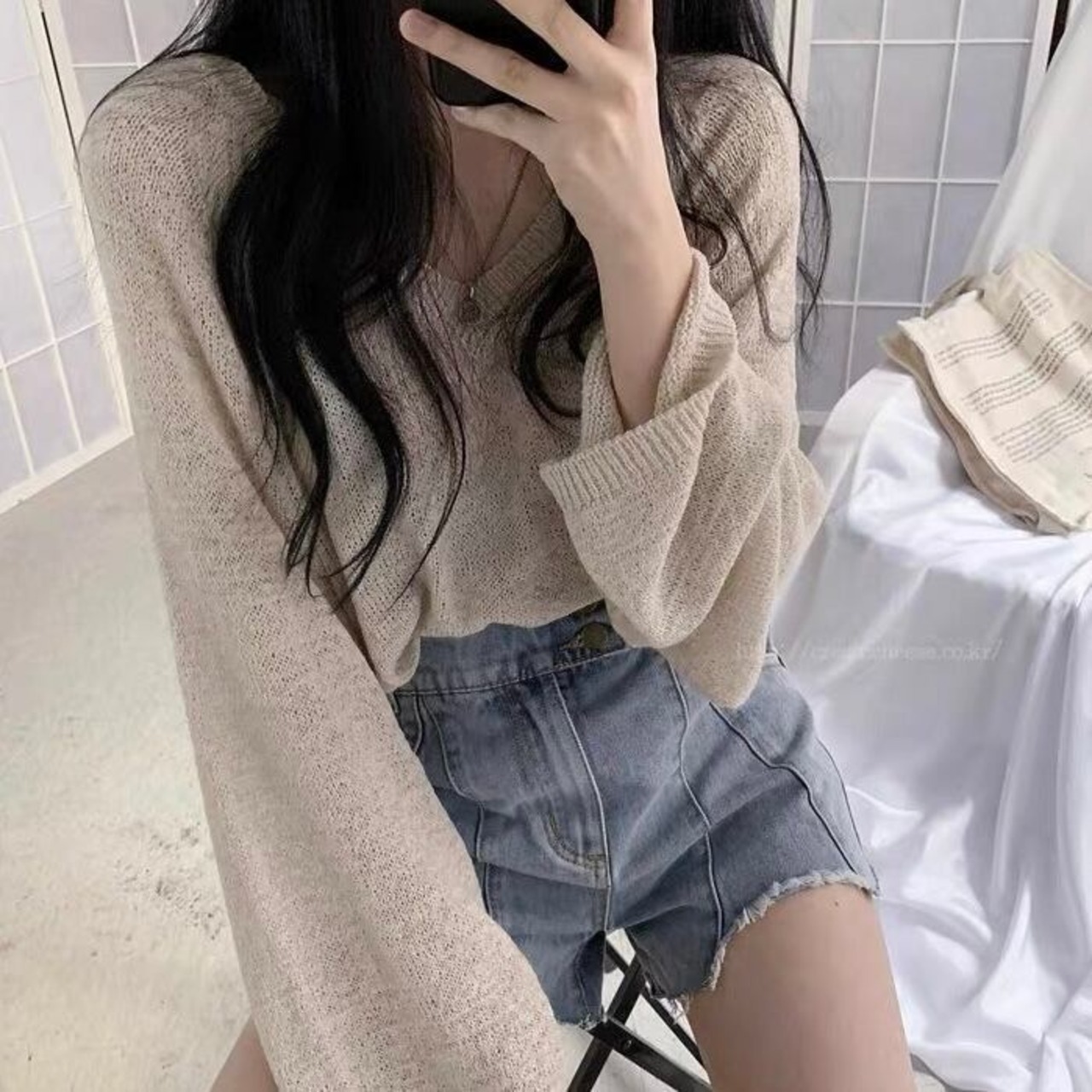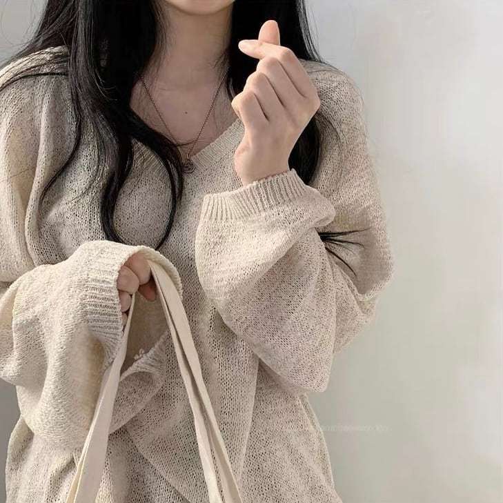 Vネック サマー ニット ルーズ カジュアル 長袖 [gg-1161]