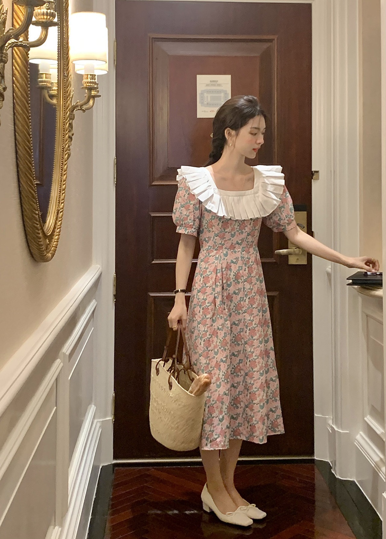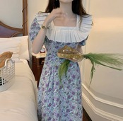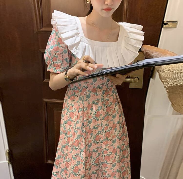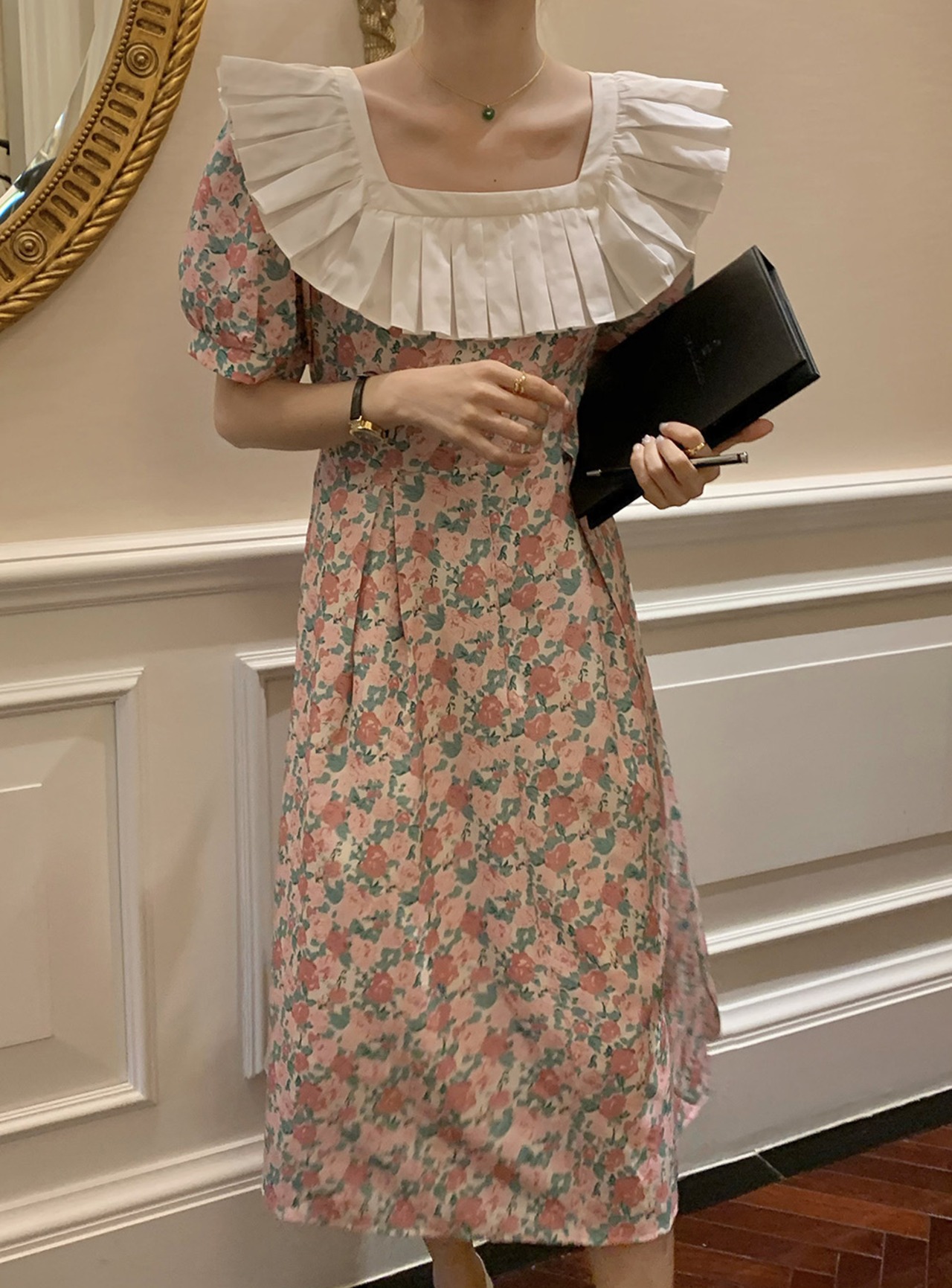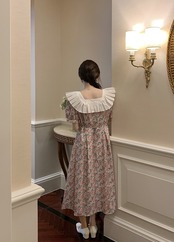 ビッグカラー 花柄 ミモレ丈 ワンピース カジュアル [gg-1214]