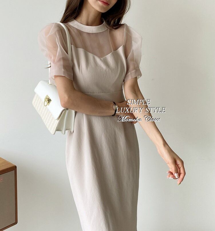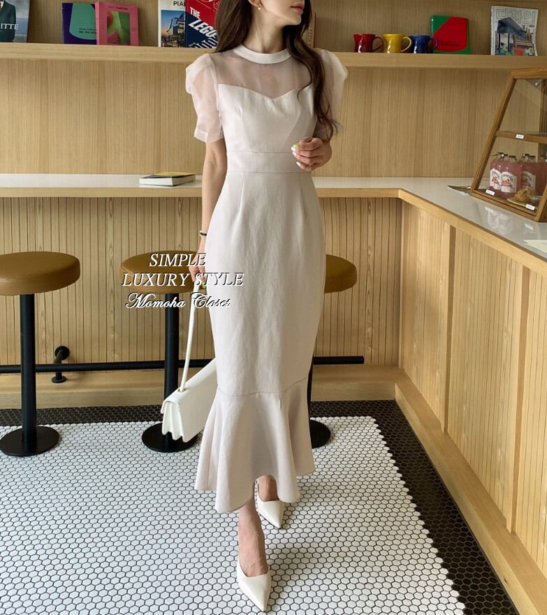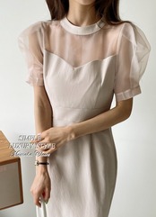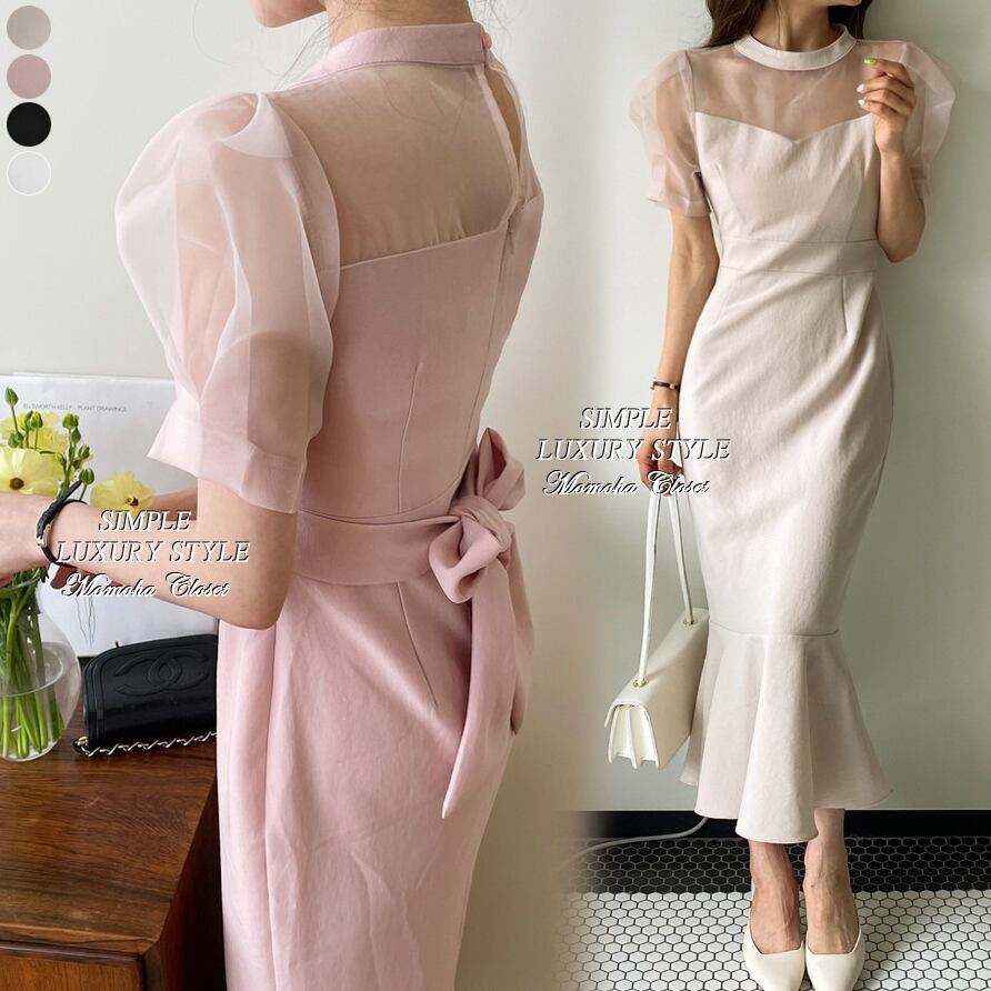 パフスリーブ シースルー リボン マーメイド ワンピース [gg-1428]