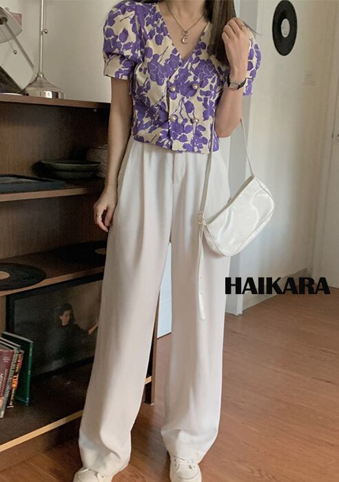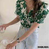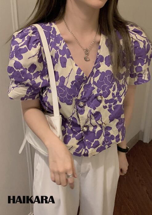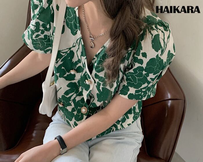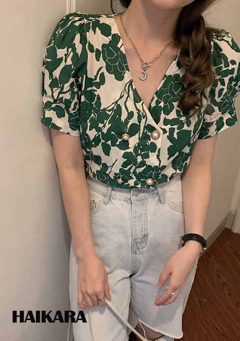 パールボタン 花柄 パフ ブラウス [gg-1513]