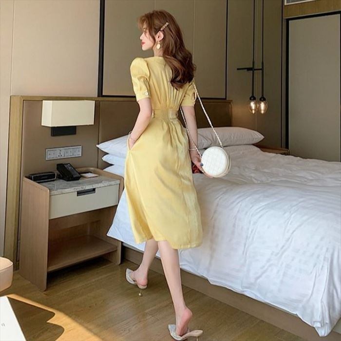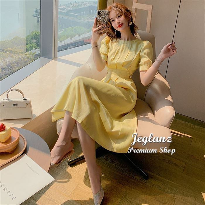 タック入り ウエスト シェイプ 半袖 フレア ワンピミドル丈 [gg-1533]