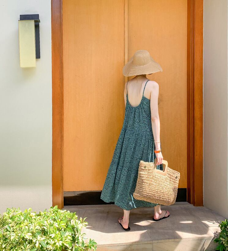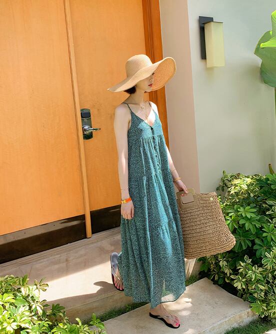 サマードレス リーフ柄 背中開き Aライン フレアワンピース [gg-1605]
