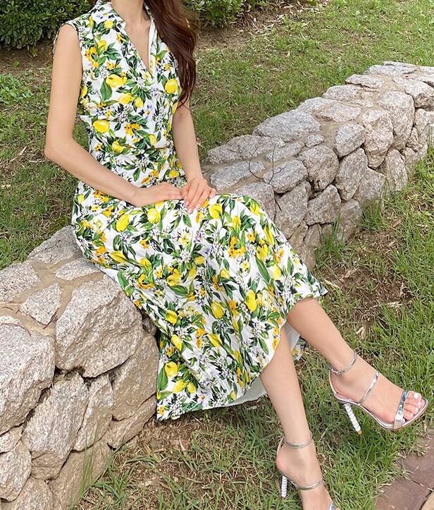 ワンピース ロング フルーツ柄 Vネック クロス フロント [gg-1610]