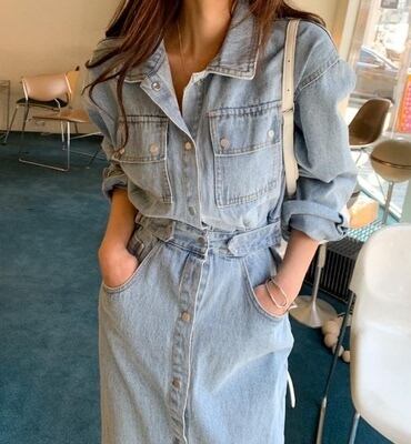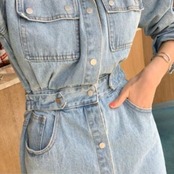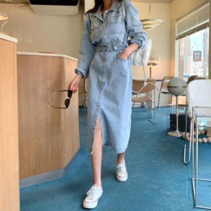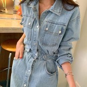 デニムワンピース ウエストベルト ミモレ丈 長袖 タイト韓国系 [gg-1756]