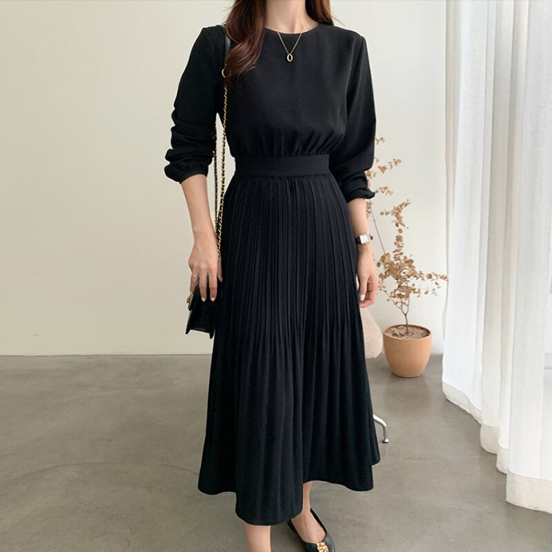 プリーツワンピース 長袖 無地 ウエストバンド [gg-1804]
