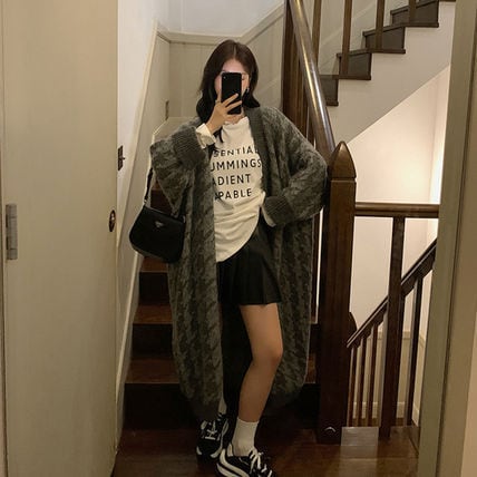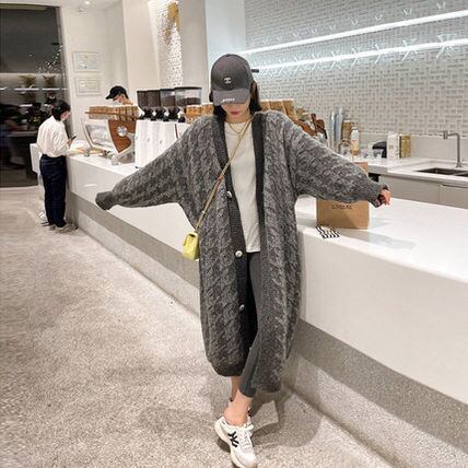 ロングカーディガン ニット 千鳥格子 カジュアル ゆったり 韓国 [gg-1840]
