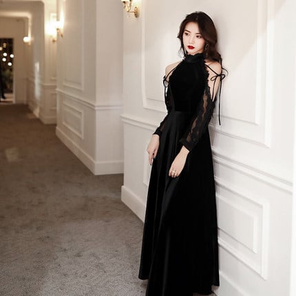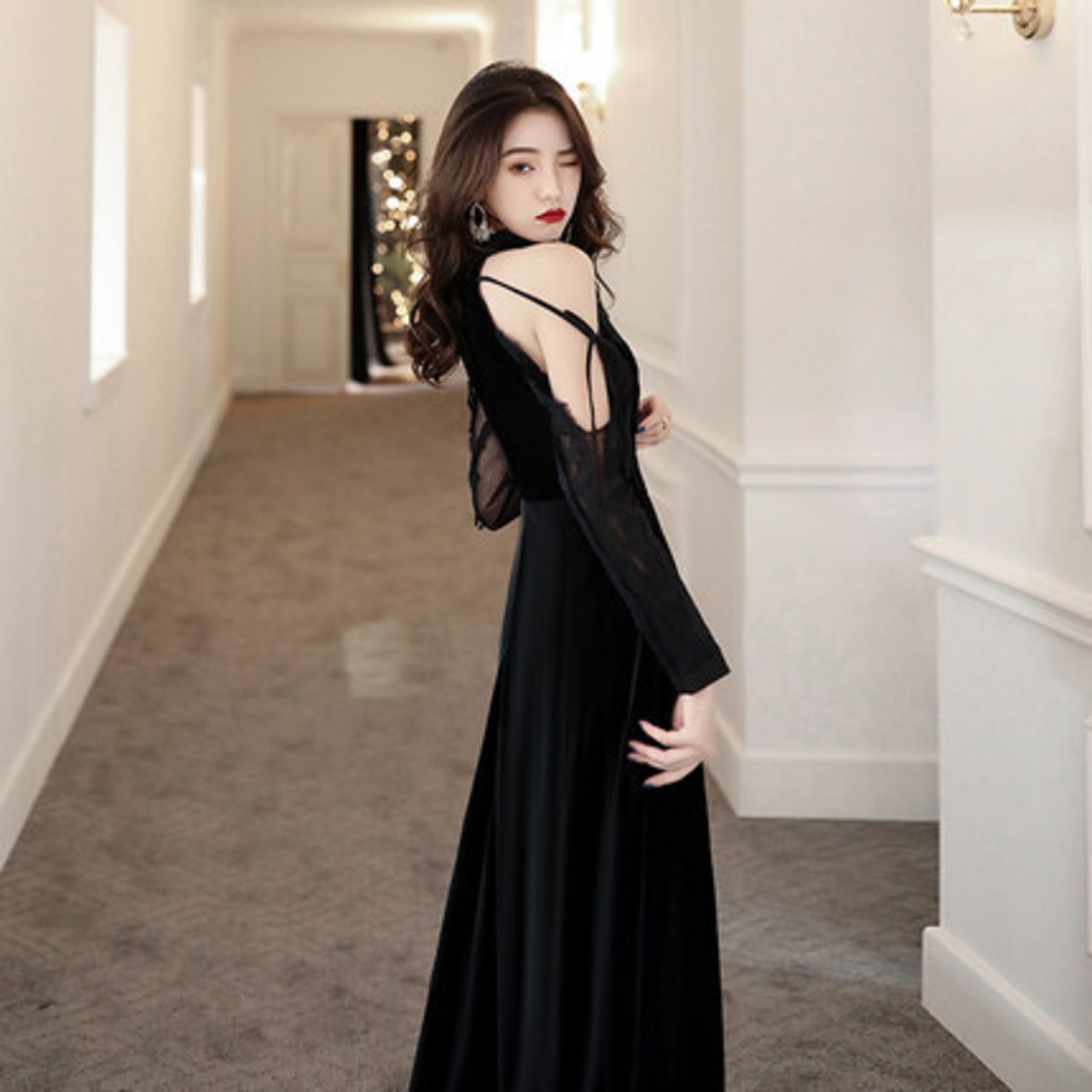 ロング ベロア パーティードレス 肩出し リボン レース [gg-1916]
