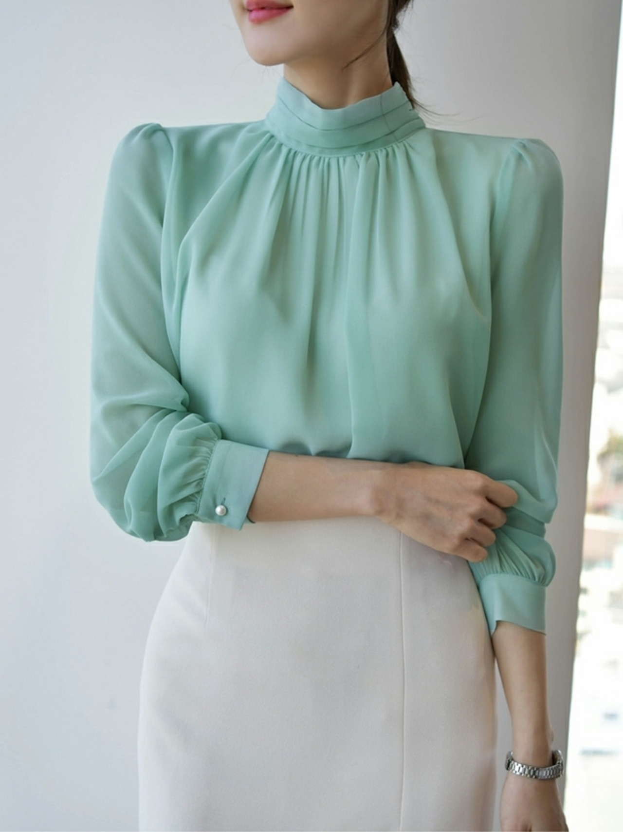 ハイネック パールボタン シフォンシャツ ブラウス 長袖 全2色 [gg-2037]