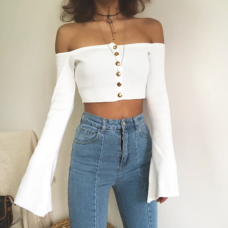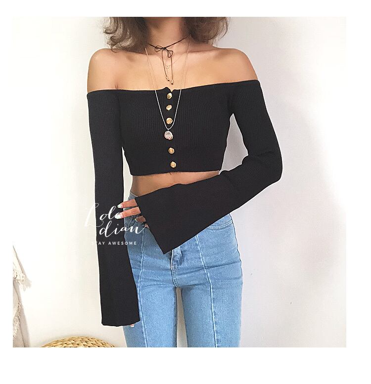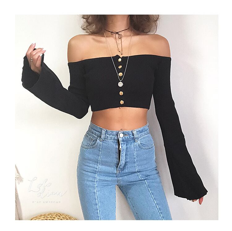 クロップ丈リブニットオフショルトップス(3色) [gg-2088]