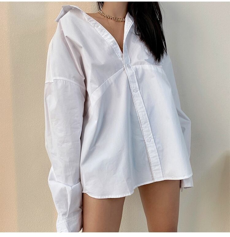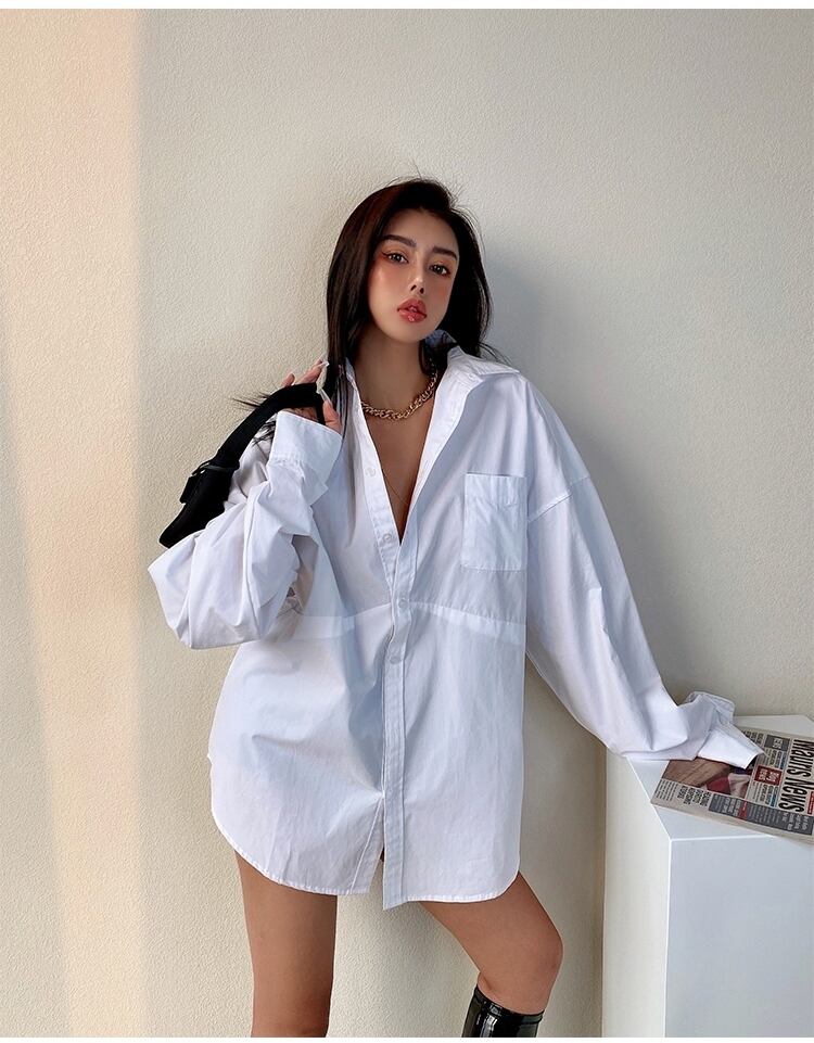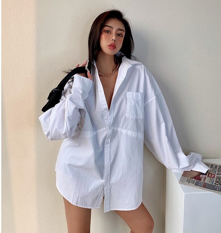 シンプルミドル丈ルーズスリム長袖シャツ ワンピース トップス [gg-2089]