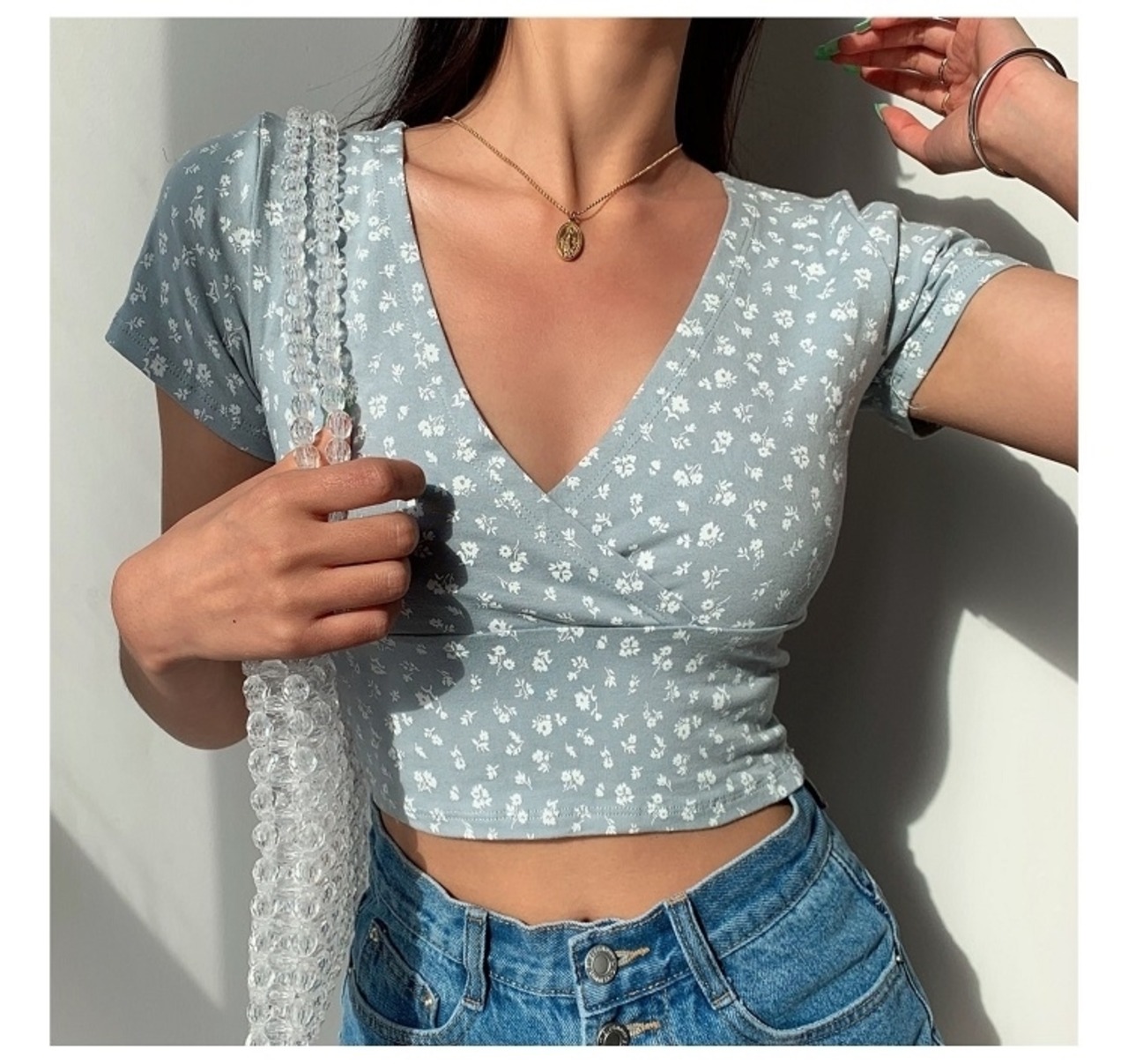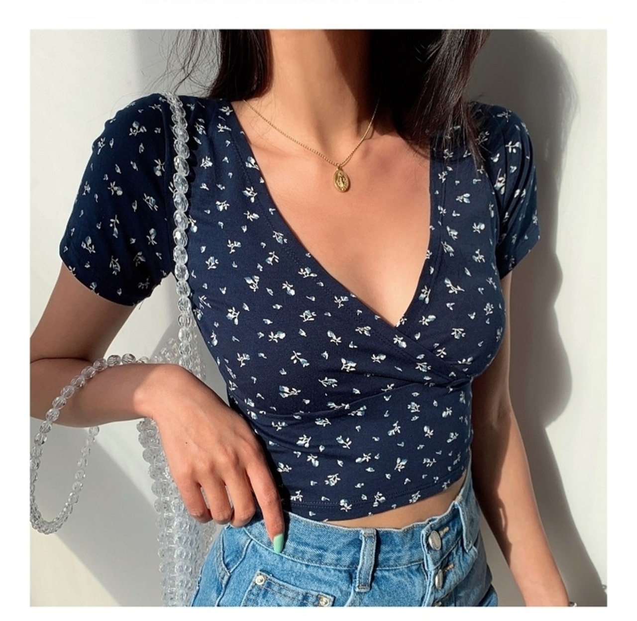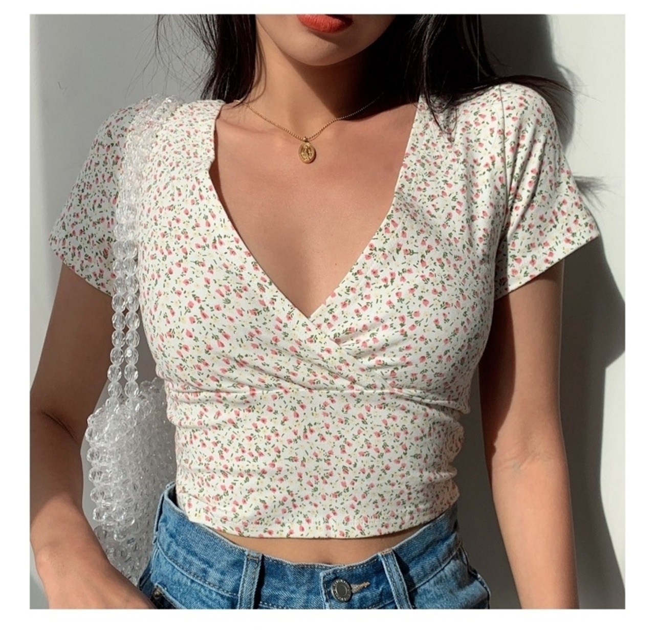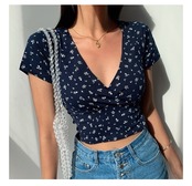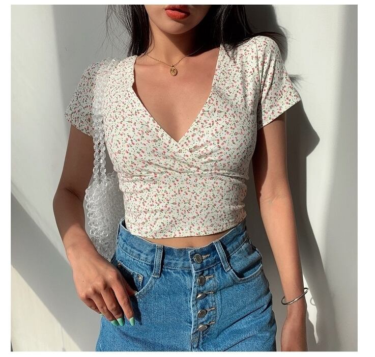 5色展開フローラル柄クロスVネックショート丈トップスTシャツ [gg-2090]