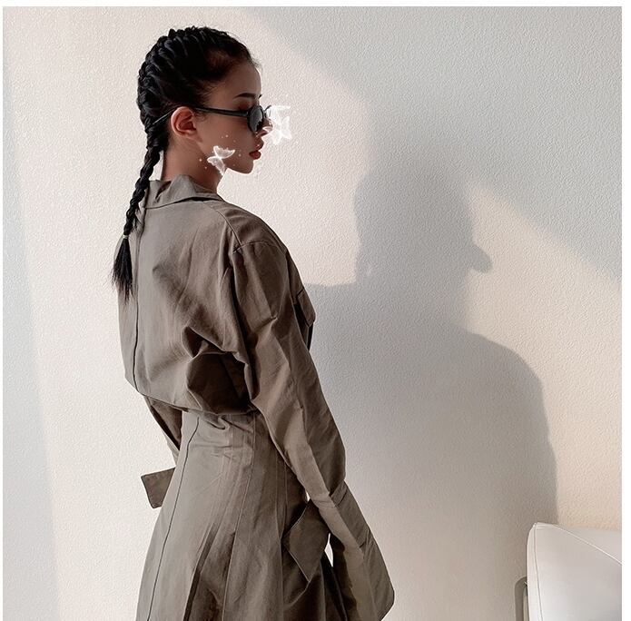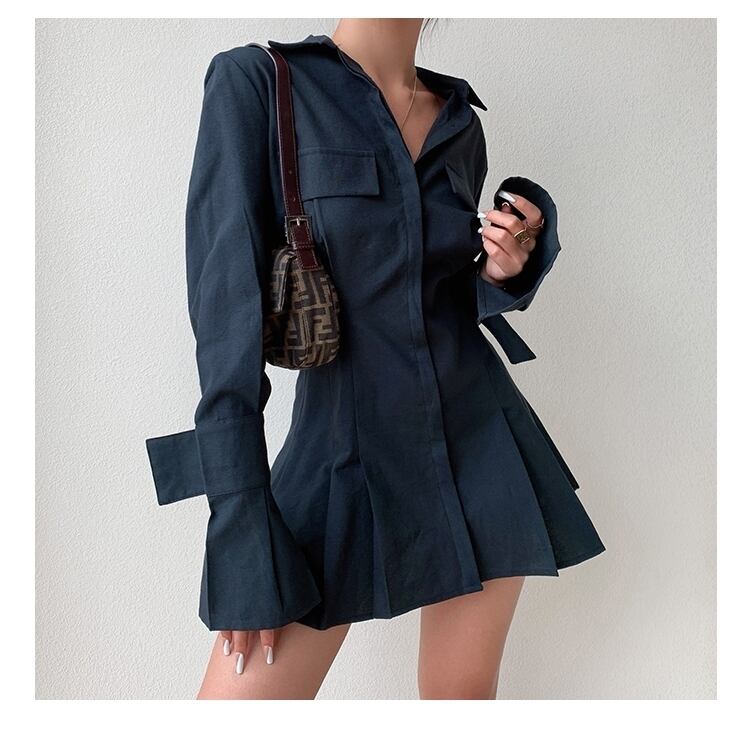 Aライン ウエスト プリーツ シャツ ワンピース ドレス [gg-2095]